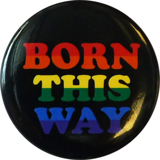 1.5″ digitally printed round “Born This Way” buttons, laminated with safety pin backing.