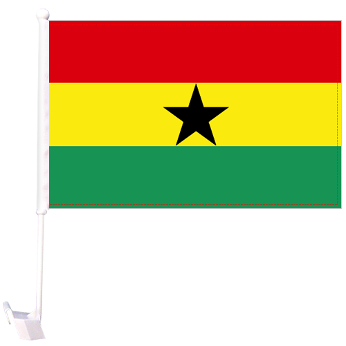 Our Ghana car flags are printed on knitted polyester, the ideal fabric for moving vehicles. The white window pole and clip are made of plastic, strong enough to be used on the highway. These car flags clip nicely onto most car windows.