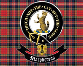 Clan Macpherson of Cluny, Scotland. From the Gaelic ‘Macaphersein’, meaning ‘son of the parson’, and traditionally descended from Muirich (or Murdo) Cattenach. In was from Muirich, who is said to have been chief in 1153, that the Macphersons derive the name of the clan Muirich or Vuirich. This Muirich was parson of Kingussie in the lower part of Badenoch, and the surname was given to his descendants. He was the great-grandson of Gillichattan Mor, the founder of the clan, who lived in the reign of Malcolm Canmore. By the 9th century, they were part of Clan Chattan under Gillie Chattan Mor.
