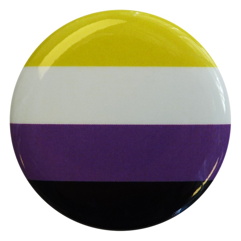 1.5″ digitally printed round Non-binary buttons, laminated with safety pin backing.